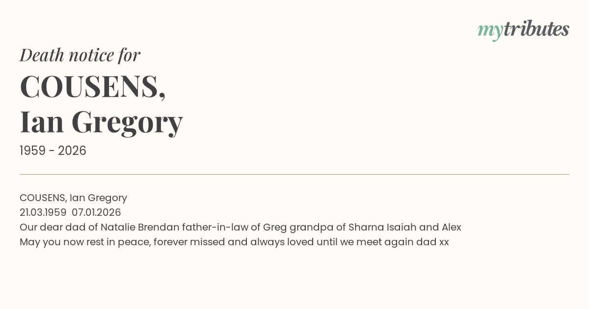 16°CCOUSENS, Ian Gregory 21.03.1959 – 07.01.2026 Our dear dad of Natalie Brendan father-in-law of Greg grandpa of Sharna Isaiah and Alex May you now rest in peace, forever missed and always loved until we meet again dad xx