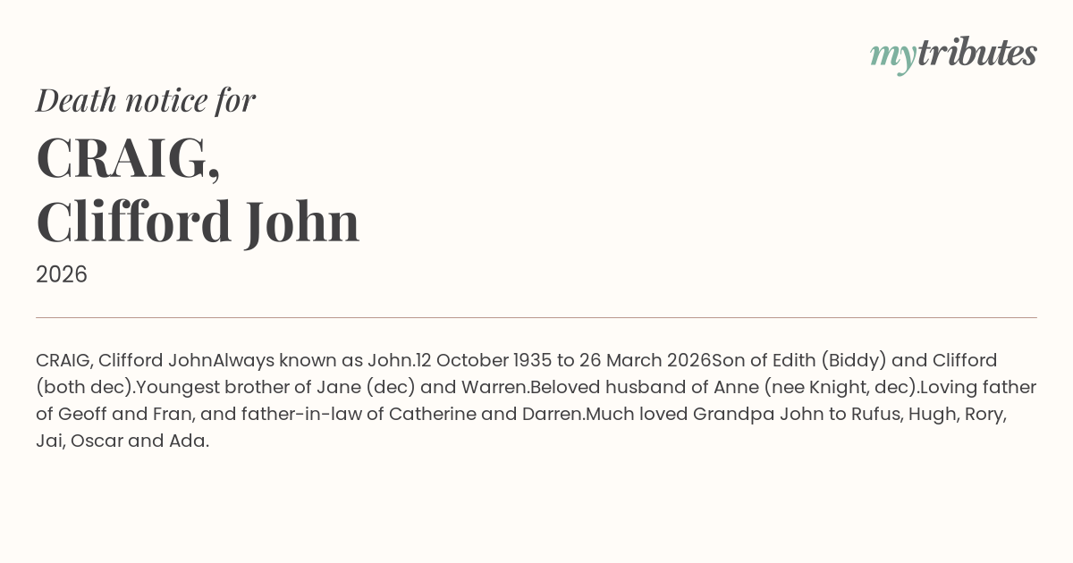 Loving father of Geoff and Fran, and father-in-law of Catherine and Darren.
