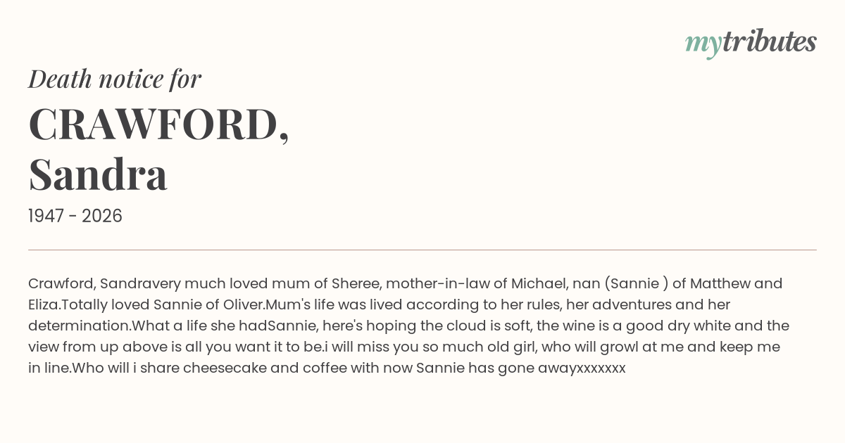 very much loved mum of Sheree, mother-in-law of Michael, nan (Sannie ) of Matthew and Eliza.
