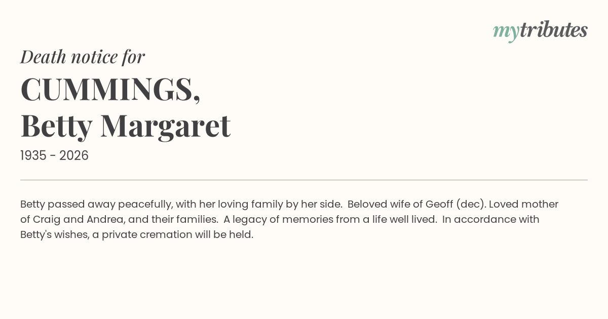 16°CBetty passed away peacefully, with her loving family by her side. Beloved wife of Geoff (dec). Loved mother of Craig and Andrea, and their families. A legacy of memories from a life well lived. In accordance with Betty's wishes, a private cremation will be held.