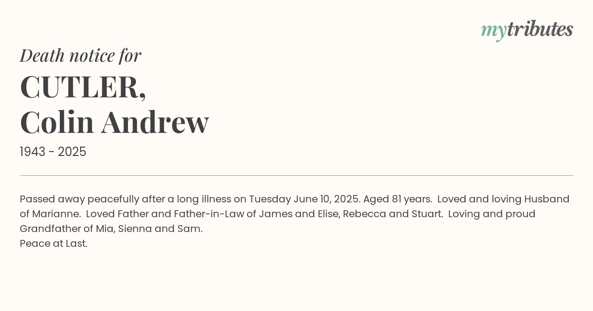 16°CPassed away peacefully after a long illness on Tuesday June 10, 2025. Aged 81 years. Loved and loving Husband of Marianne. Loved Father and Father-in-Law of James and Elise, Rebecca and Stuart. Loving and proud Grandfather of Mia, Sienna and Sam.