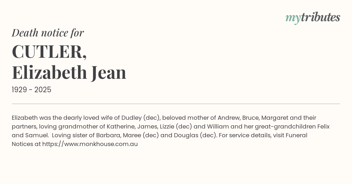 16°CElizabeth was the dearly loved wife of Dudley (dec), beloved mother of Andrew, Bruce, Margaret and their partners, loving grandmother of Katherine, James, Lizzie (dec) and William and her great-grandchildren Felix and Samuel. Loving sister of Barbara, Maree (dec)