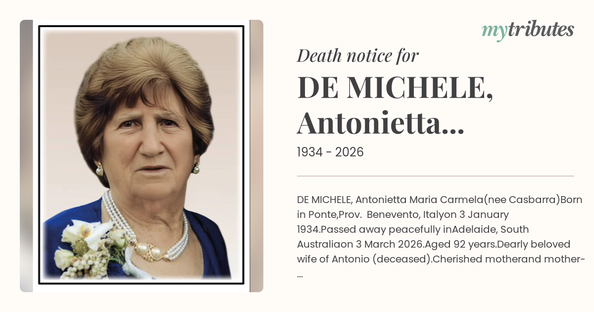 Antonietta is dearly loved and will be sadly missed by her brothers and sisters living and deceased, relatives and friends in Australia and overseas.