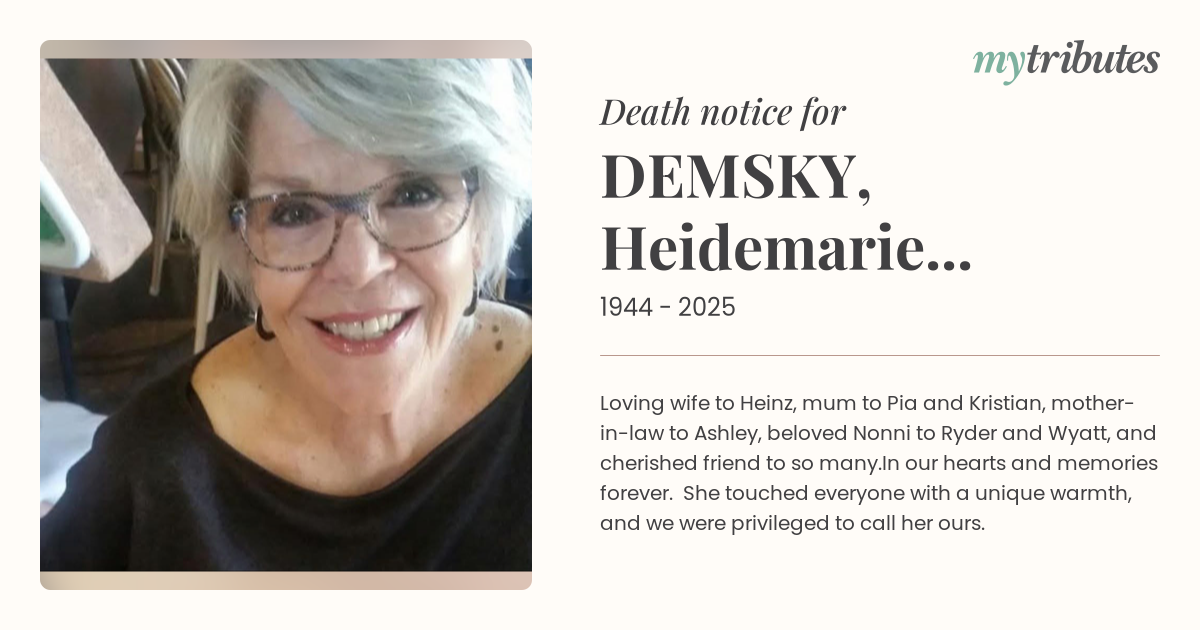 16°CLoving wife to Heinz, mum to Pia and Kristian, mother-in-law to Ashley, beloved Nonni to Ryder and Wyatt, and cherished friend to so many.