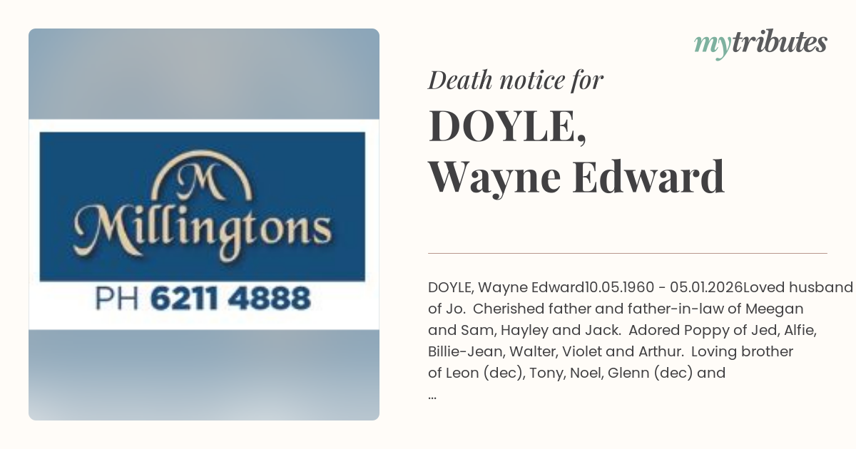 Loved husband of Jo. Cherished father and father-in-law of Meegan and Sam, Hayley and Jack. Adored Poppy of Jed, Alfie, Billie-Jean, Walter, Violet and Arthur. Loving brother of Leon (dec), Tony, Noel, Glenn (dec) and partners.