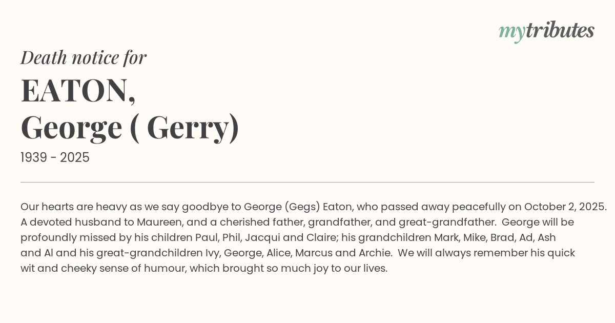 16°COur hearts are heavy as we say goodbye to George (Gegs) Eaton, who passed away peacefully on October 2, 2025. A devoted husband to Maureen, and a cherished father, grandfather, and great-grandfather. George will be profoundly missed by his children Paul, Phil, Jacqui and Claire; his grandchildren Mark, Mike, Brad, Ad, Ash and Al and his great-grandchildren Ivy, George, Alice, Marcus and Archie. We will always remember his quick wit and cheeky sense of humour, which brought so much joy to our lives.