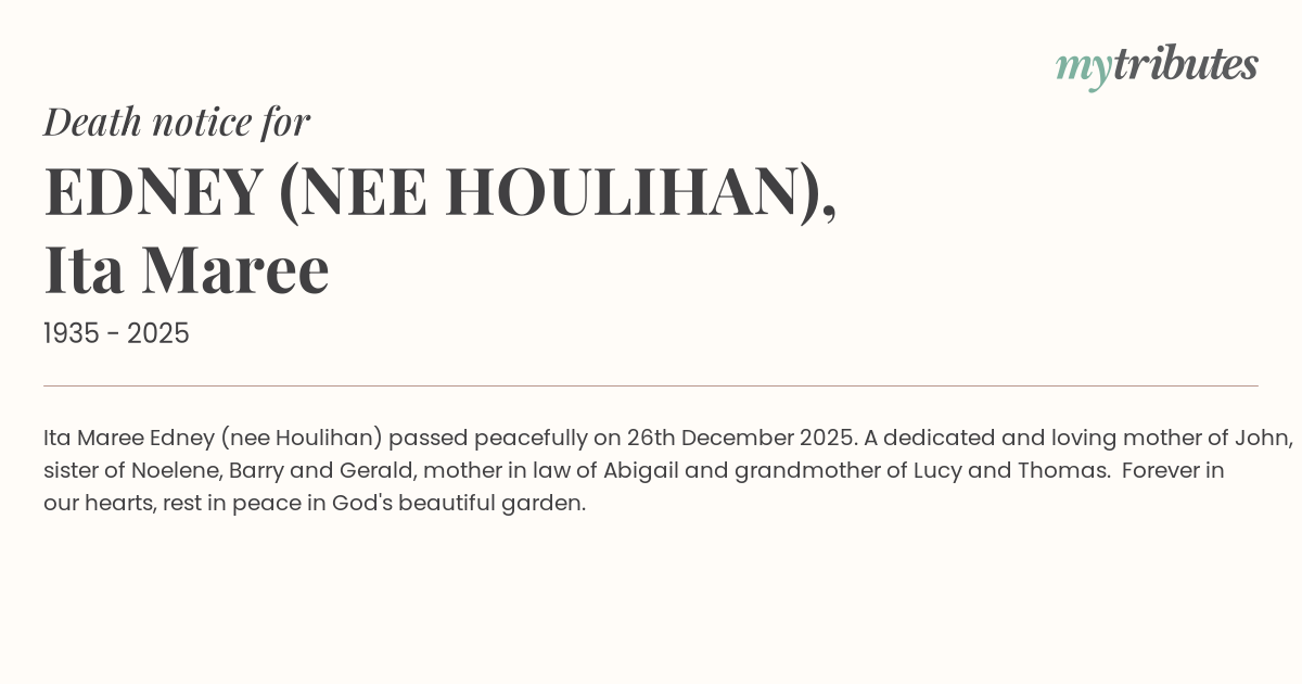 16°CIta Maree Edney (nee Houlihan) passed peacefully on 26th December 2025. A dedicated and loving mother of John, sister of Noelene, Barry and Gerald, mother in law of Abigail and grandmother of Lucy and Thomas. Forever in our hearts, rest in peace in God's beautiful garden.