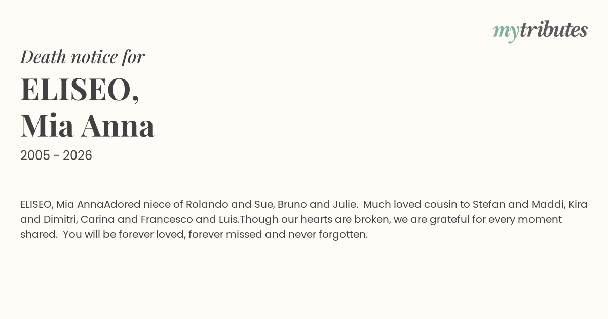 Adored niece of Rolando and Sue, Bruno and Julie. Much loved cousin to Stefan and Maddi, Kira and Dimitri, Carina and Francesco and Luis.