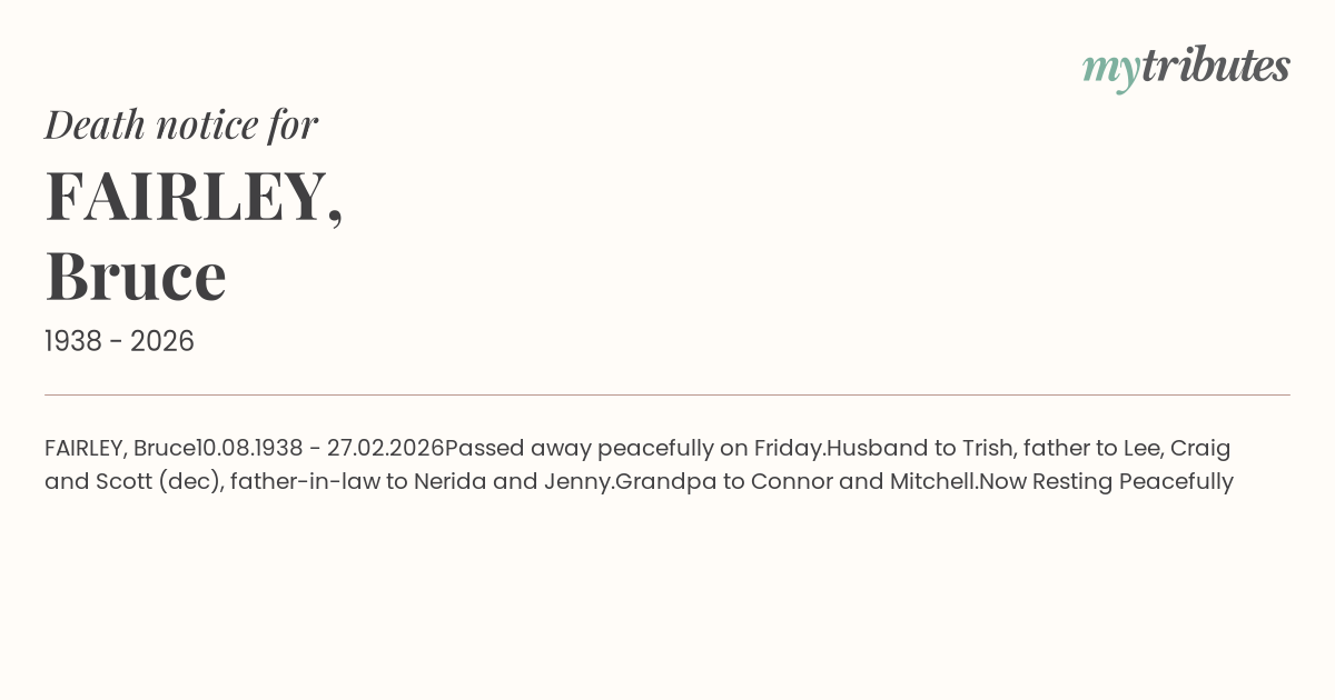 Husband to Trish, father to Lee, Craig and Scott (dec), father-in-law to Nerida and Jenny.