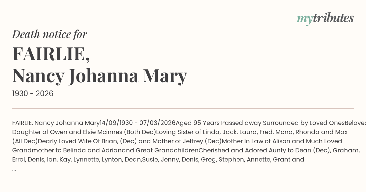 Beloved Daughter of Owen and Elsie Mcinnes (Both Dec)
