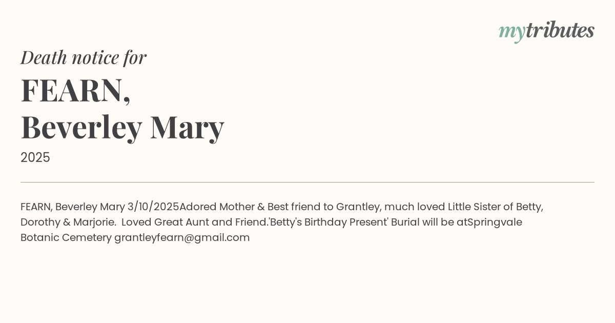 Adored Mother & Best friend to Grantley, much loved Little Sister of Betty, Dorothy & Marjorie. Loved Great Aunt and Friend.