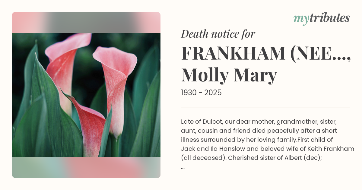 First child of Jack and Ila Hanslow and beloved wife of Keith Frankham (all deceased). Cherished sister of Albert (dec); Mavis, Bill (dec) and Laurie.