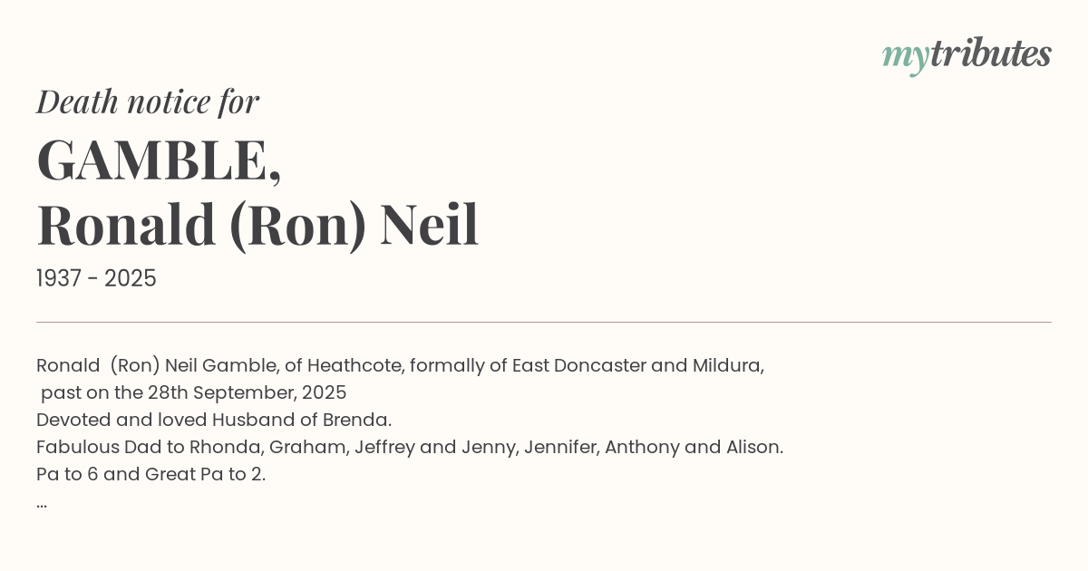 16°CRonald (Ron) Neil Gamble, of Heathcote, formally of East Doncaster and Mildura,