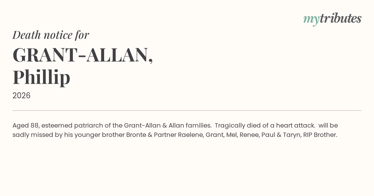 16°CAged 88, esteemed patriarch of the Grant-Allan & Allan families. Tragically died of a heart attack. will be sadly missed by his younger brother Bronte & Partner Raelene, Grant, Mel, Renee, Paul & Taryn, RIP Brother.