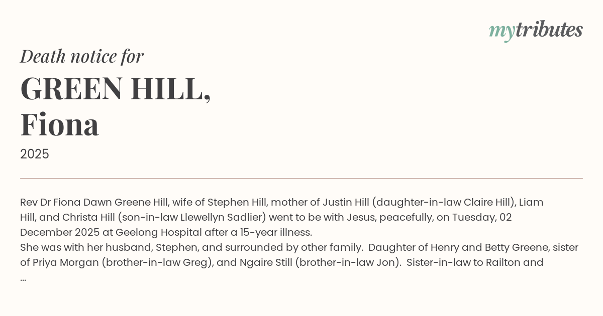 16°CRev Dr Fiona Dawn Greene Hill, wife of Stephen Hill, mother of Justin Hill (daughter-in-law Claire Hill), Liam Hill, and Christa Hill (son-in-law Llewellyn Sadlier) went to be with Jesus, peacefully, on Tuesday, 02 December 2025 at Geelong Hospital after a 15-year illness.