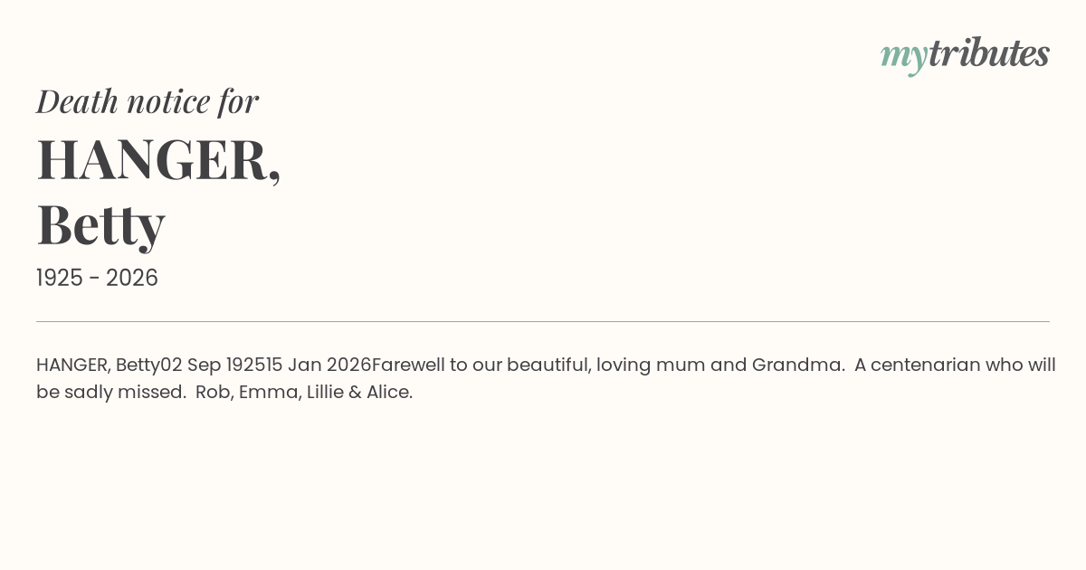 Farewell to our beautiful, loving mum and Grandma. A centenarian who will be sadly missed. Rob, Emma, Lillie & Alice.
