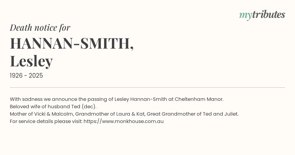 16°CWith sadness we announce the passing of Lesley Hannan-Smith at Cheltenham Manor.