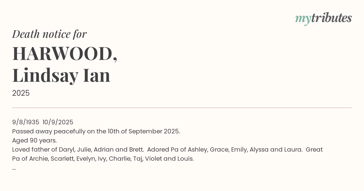 Loved father of Daryl, Julie, Adrian and Brett. Adored Pa of Ashley, Grace, Emily, Alyssa and Laura. Great Pa of Archie, Scarlett, Evelyn, Ivy, Charlie, Taj, Violet and Louis.