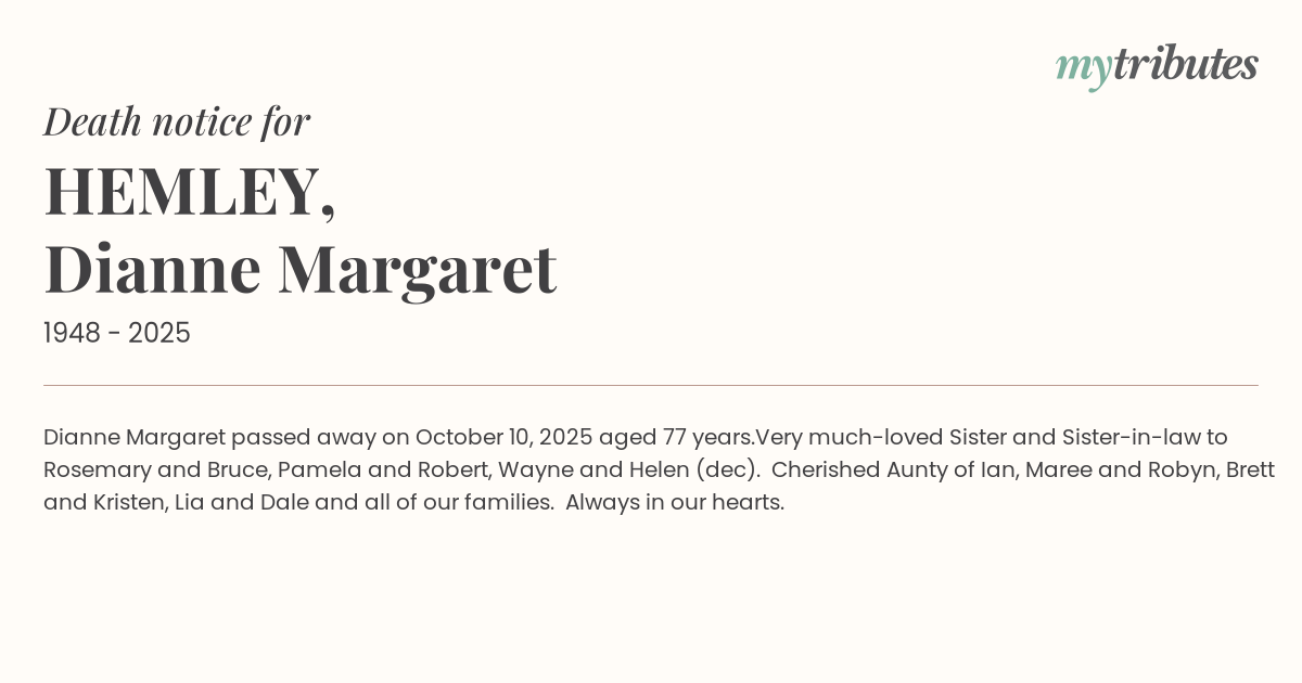16°CDianne Margaret passed away on October 10, 2025 aged 77 years.
