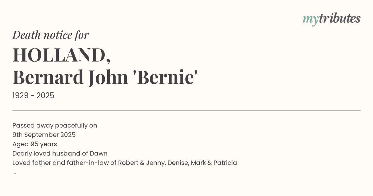16°CPassed away peacefully on 9th September 2025 Aged 95 years Dearly loved husband of Dawn Loved father and father-in-law of Robert & Jenny, Denise, Mark & Patricia Grandfather to Laura, Kieran, Patrick, Nicholas, Liam, Dominique and Genevieve Great-grandfather to Angus, Pippa and Louise