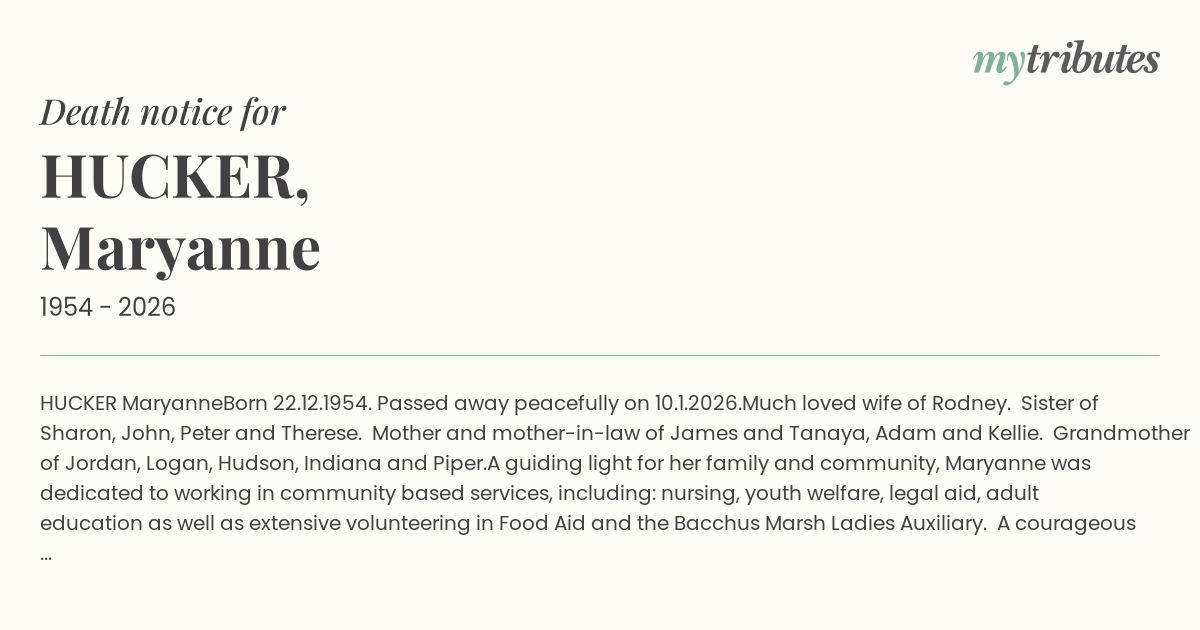 A guiding light for her family and community, Maryanne was dedicated to working in community based services, including: nursing, youth welfare, legal aid, adult education as well as extensive volunteering in Food Aid and the Bacchus Marsh Ladies Auxiliary.
