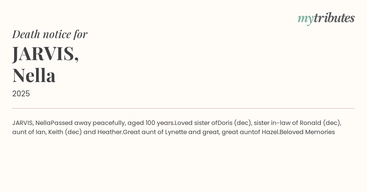 Doris (dec), sister in-law of Ronald (dec), aunt of Ian, Keith (dec) and Heather.