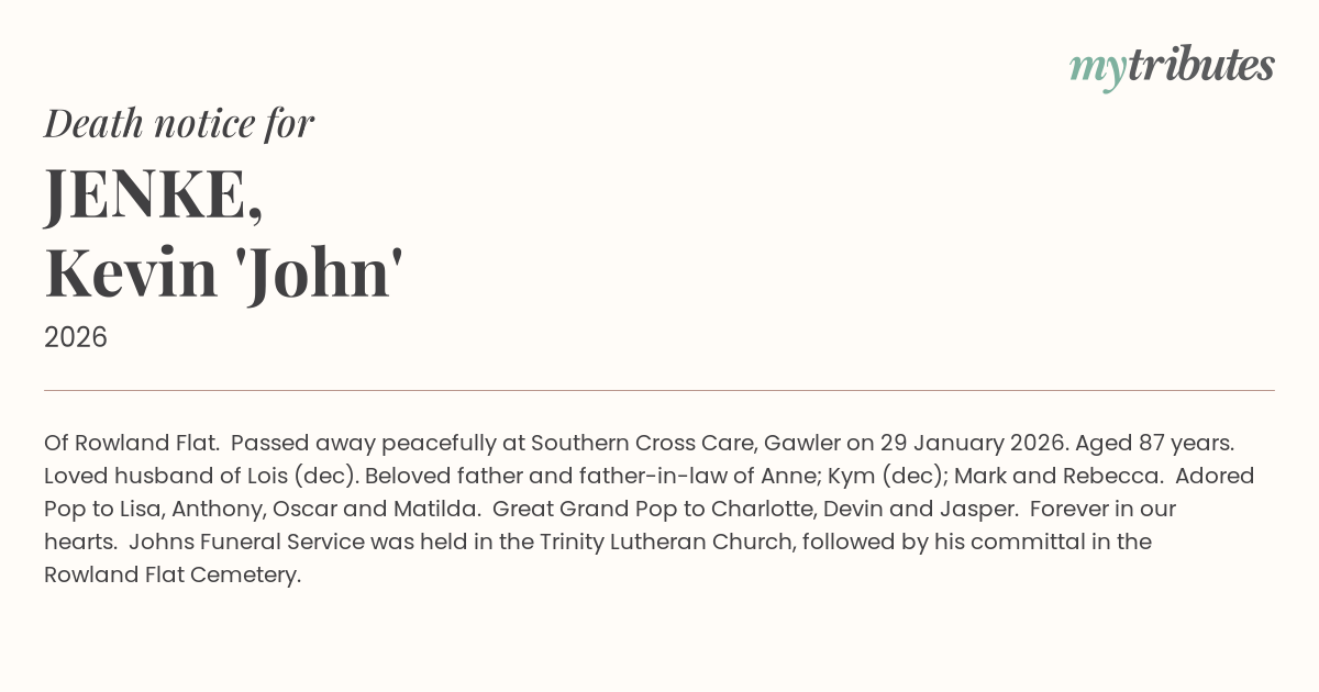 Passed away peacefully at Southern Cross Care, Gawler on 29 January 2026.