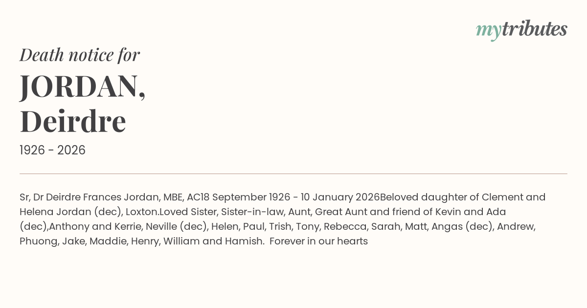 16°CSr, Dr Deirdre Frances Jordan, MBE, AC