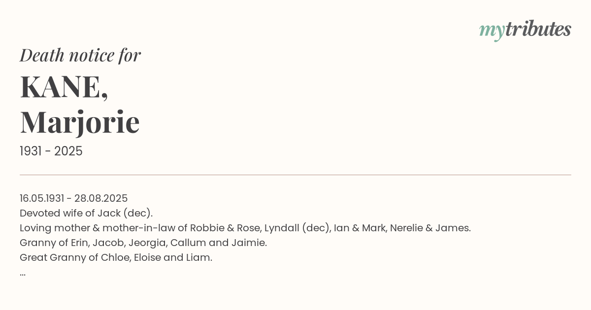 16°C16.05.1931 - 28.08.2025 Devoted wife of Jack (dec). Loving mother & mother-in-law of Robbie & Rose, Lyndall (dec), Ian & Mark, Nerelie & James. Granny of Erin, Jacob, Jeorgia, Callum and Jaimie. Great Granny of Chloe, Eloise and Liam. Always In Our Hearts.