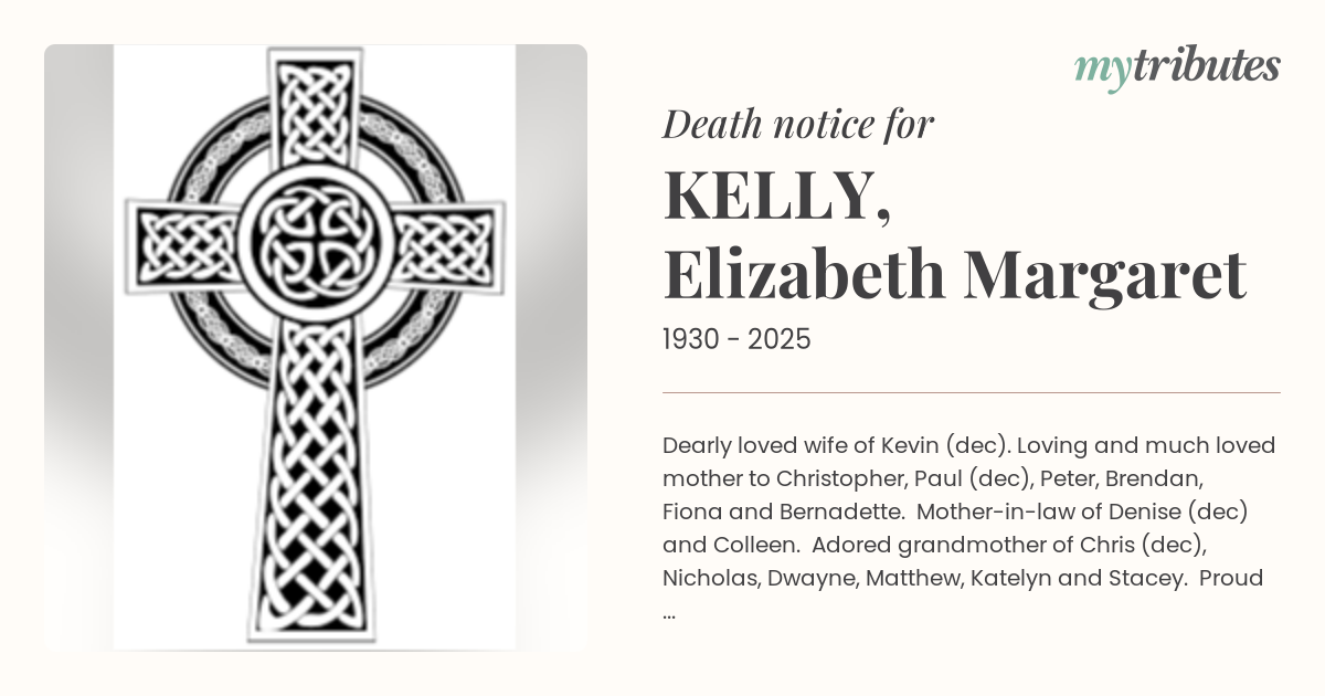 Loving and much loved mother to Christopher, Paul (dec), Peter, Brendan, Fiona and Bernadette.