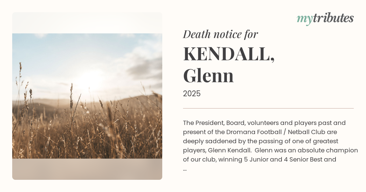 16°CThe President, Board, volunteers and players past and present of the Dromana Football / Netball Club are deeply saddened by the passing of one of greatest players, Glenn Kendall. Glenn was an absolute champion of our club, winning 5 Junior and 4 Senior Best and Fairest club awards. Our sincere condolences to Julie and Glenn`s extended family and close friends. Glenn is now at rest after a long and brave battle - He was the definitive example of spirit and couragous adversity.