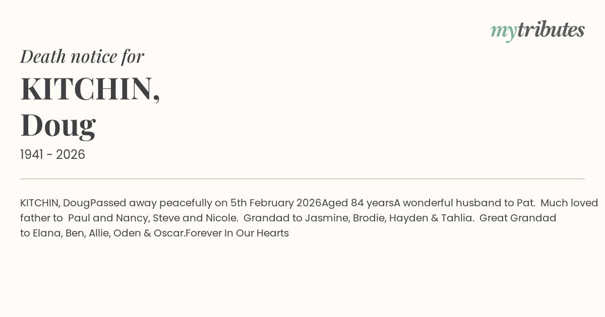 Grandad to Jasmine, Brodie, Hayden & Tahlia. Great Grandad to Elana, Ben, Allie, Oden & Oscar.