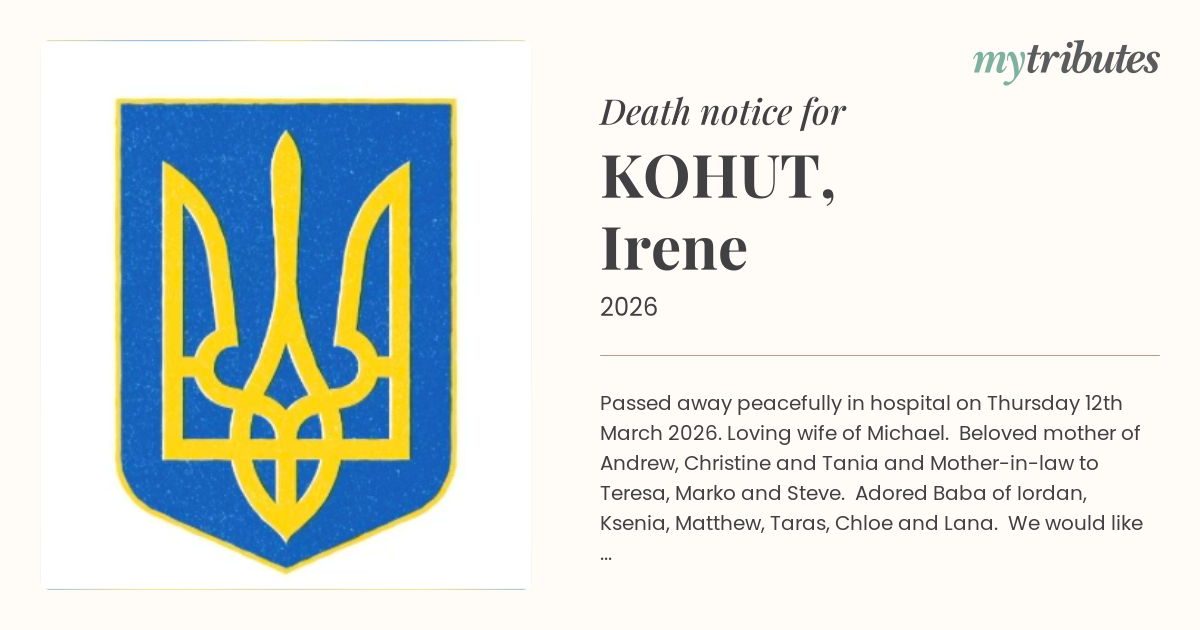 For funeral details, please visit Irene's tribute page at https://tobinbrothers.com.au/tribute/irene-kohut-2601926/