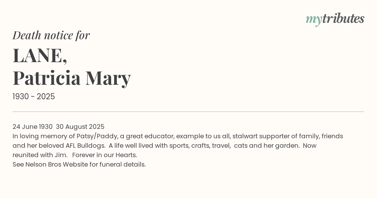 In loving memory of Patsy/Paddy, a great educator, example to us all, stalwart supporter of family, friends and her beloved AFL Bulldogs. A life well lived with sports, crafts, travel, cats and her garden. Now reunited with Jim. Forever in our Hearts.