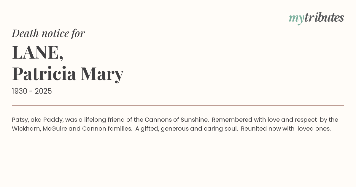 16°CPatsy, aka Paddy, was a lifelong friend of the Cannons of Sunshine. Remembered with love and respect by the Wickham, McGuire and Cannon families. A gifted, generous and caring soul. Reunited now with loved ones.