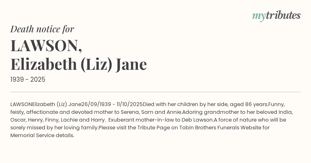 Adoring grandmother to her beloved India, Oscar, Henry, Finny, Lachie and Harry. Exuberant mother-in-law to Deb Lawson.