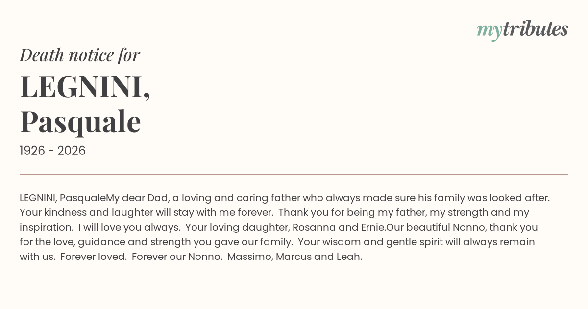 Our beautiful Nonno, thank you for the love, guidance and strength you gave our family. Your wisdom and gentle spirit will always remain with us. Forever loved. Forever our Nonno. Massimo, Marcus and Leah.