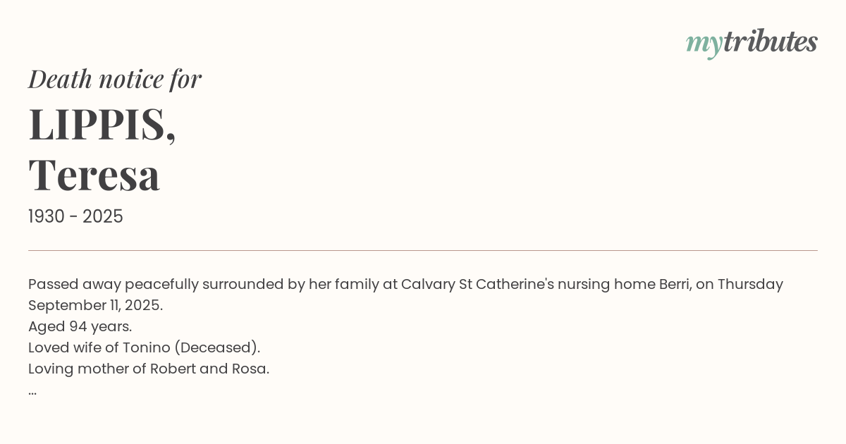 16°CPassed away peacefully surrounded by her family at Calvary St Catherine's nursing home Berri, on Thursday September 11, 2025.