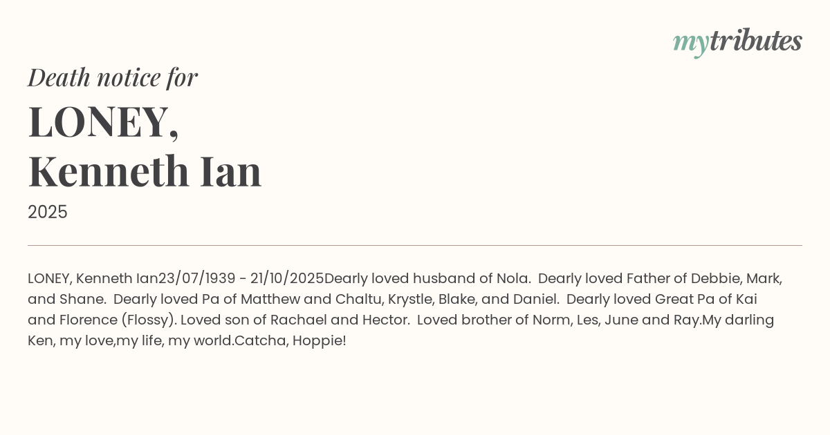 Dearly loved husband of Nola. Dearly loved Father of Debbie, Mark, and Shane. Dearly loved Pa of Matthew and Chaltu, Krystle, Blake, and Daniel. Dearly loved Great Pa of Kai and Florence (Flossy). Loved son of Rachael and Hector. Loved brother of Norm, Les, June and Ray.