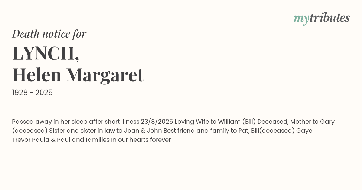 16°CPassed away in her sleep after short illness 23/8/2025 Loving Wife to William (Bill) Deceased, Mother to Gary (deceased) Sister and sister in law to Joan & John Best friend and family to Pat, Bill(deceased) Gaye Trevor Paula & Paul and families In our hearts forever