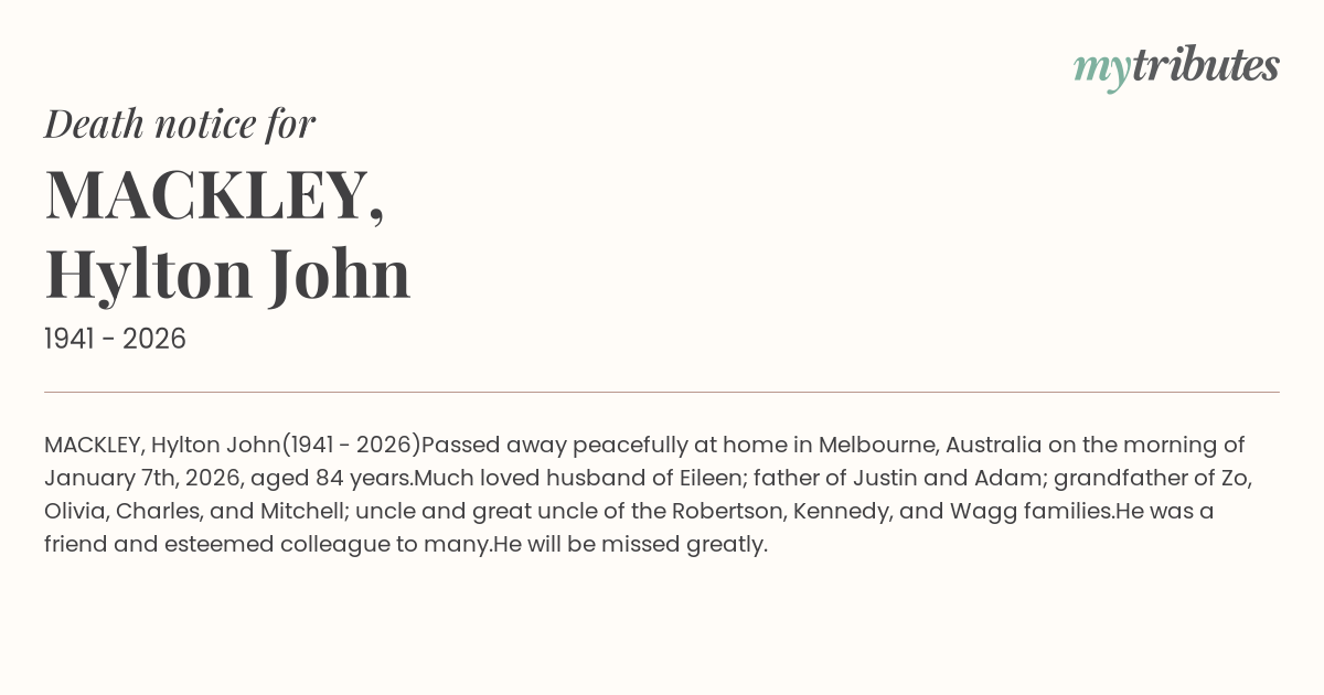 Passed away peacefully at home in Melbourne, Australia on the morning of January 7th, 2026, aged 84 years.