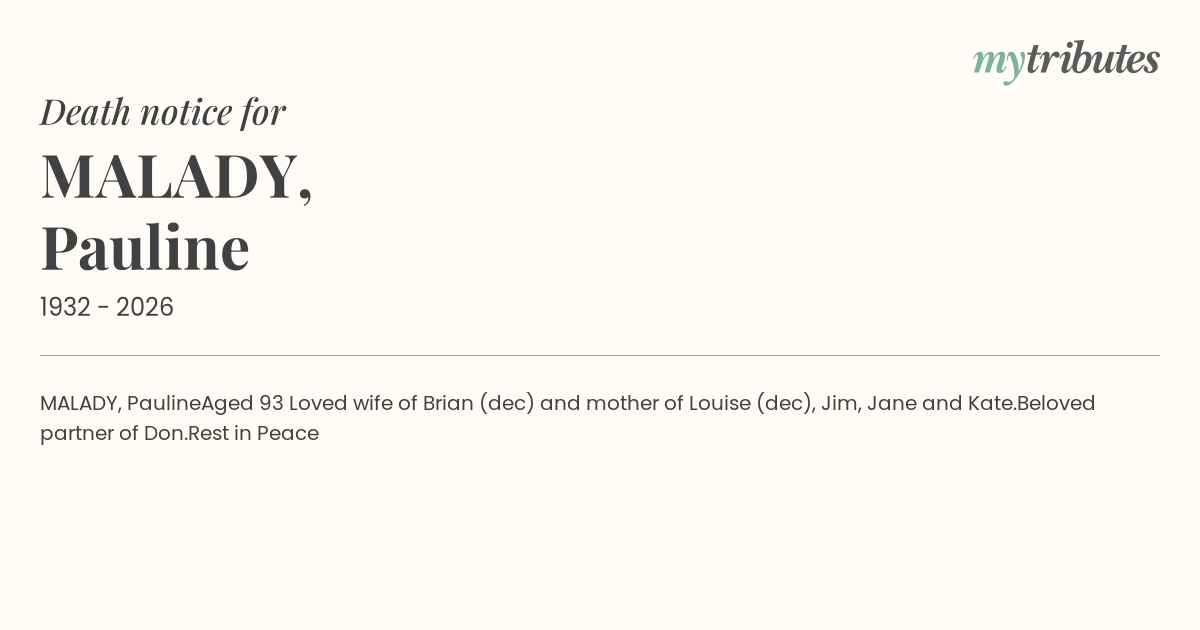 Loved wife of Brian (dec) and mother of Louise (dec), Jim, Jane and Kate.
