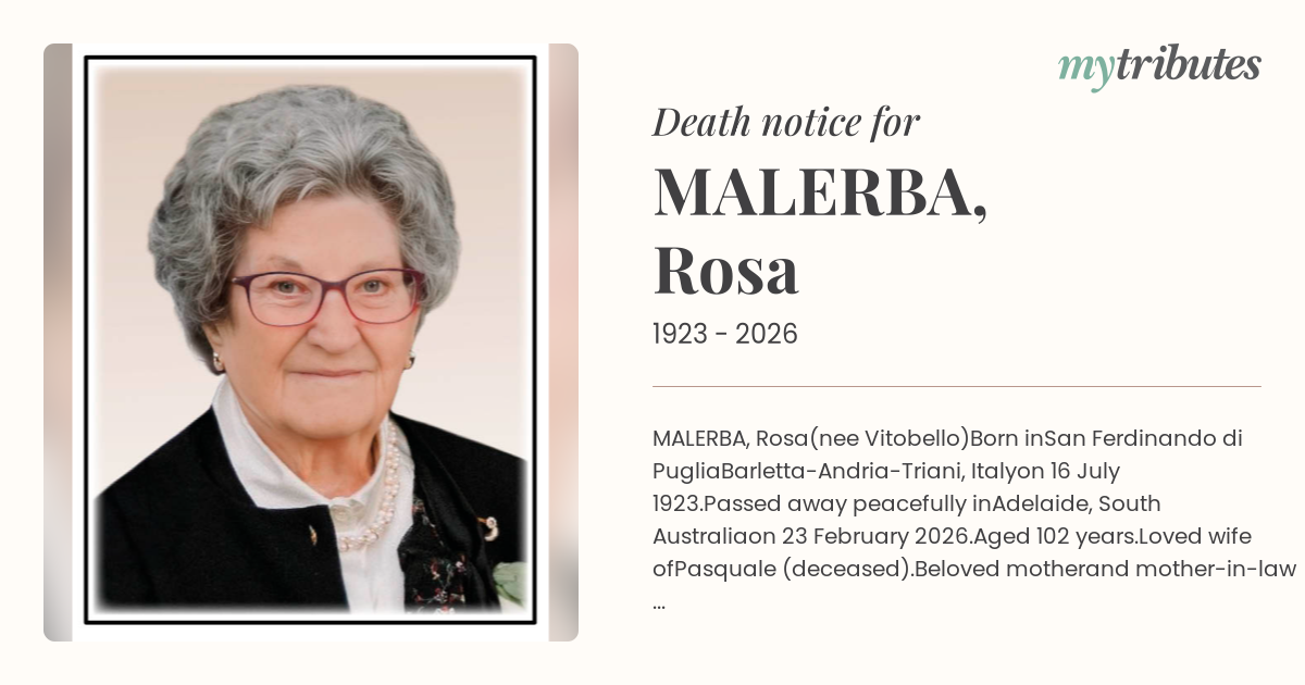 Rosa is dearly loved and will be sadly missed by her relatives and friends in Australia and overseas.