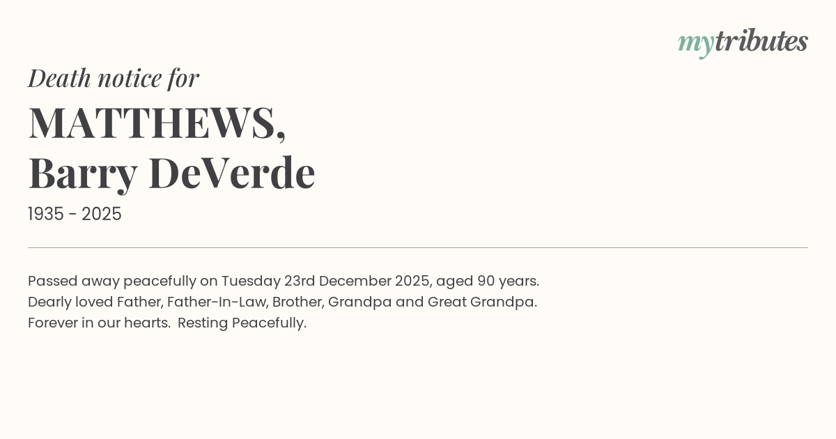 16°CPassed away peacefully on Tuesday 23rd December 2025, aged 90 years.