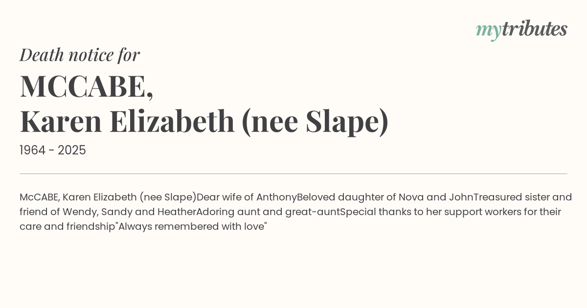 16°CMcCABE, Karen Elizabeth (nee Slape)