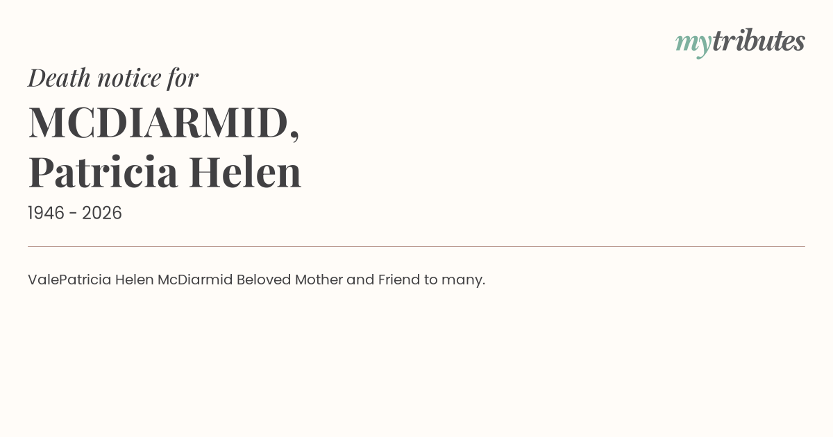 ValePatricia Helen McDiarmid Beloved Mother and Friend to many.