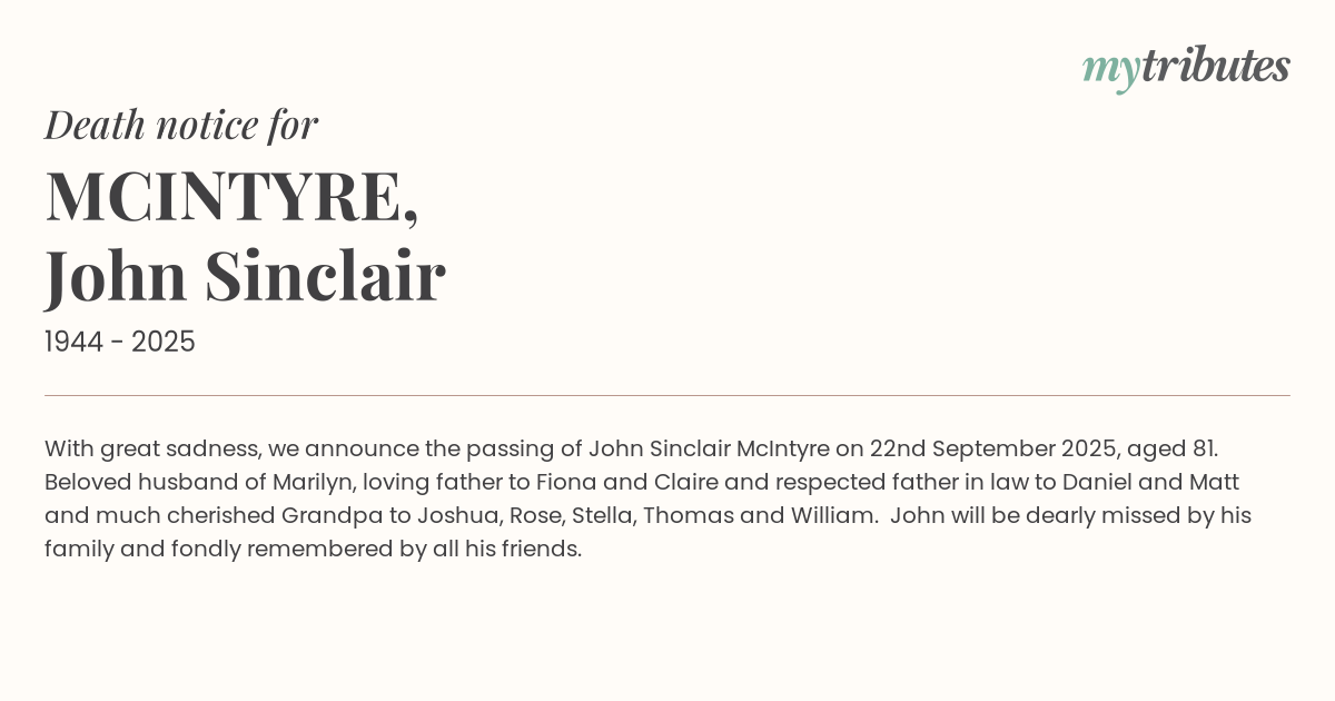 16°CWith great sadness, we announce the passing of John Sinclair McIntyre on 22nd September 2025, aged 81.
