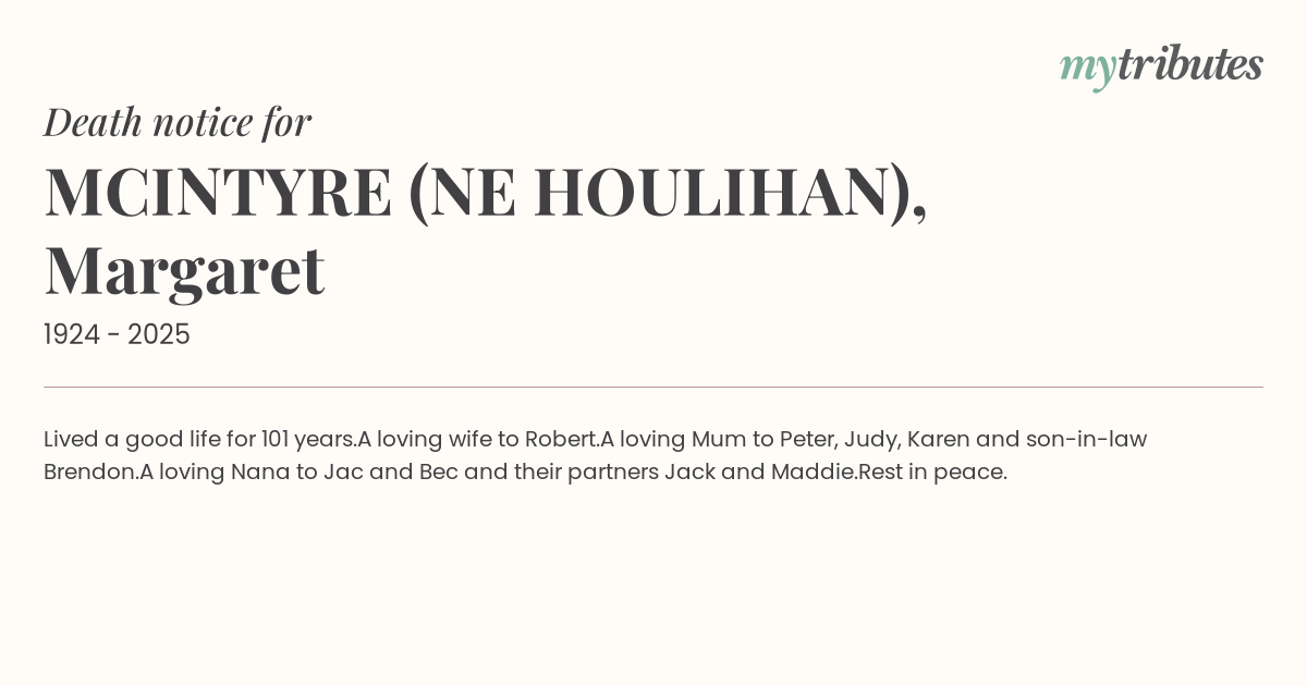 A loving Mum to Peter, Judy, Karen and son-in-law Brendon.