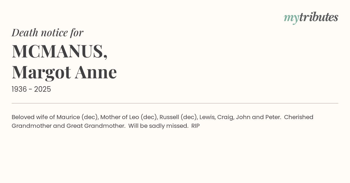 16°CBeloved wife of Maurice (dec), Mother of Leo (dec), Russell (dec), Lewis, Craig, John and Peter. Cherished Grandmother and Great Grandmother. Will be sadly missed. RIP