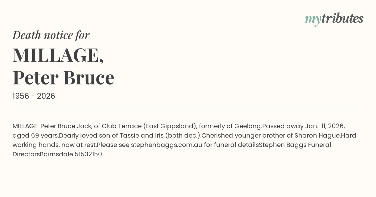 16°CMILLAGE – Peter Bruce ‘Jock’, of Club Terrace (East Gippsland), formerly of Geelong.